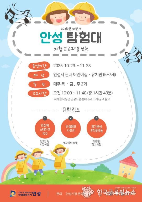 (한국글로벌뉴스 - 박소연 기자) 안성시는 상반기에 시범 운영해 큰 호응을 얻은 유아 대상 체험형 프로그램 ‘안성 탐험대: 역사 속으로, 음악 속으로!’를 하반기에도 운영하며, 지역 문화시설 활성화에 나선다.