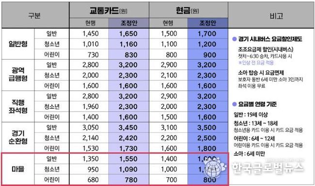 (한국글로벌뉴스 - 박소연 기자) 오는 25일 첫차부터 성남 지역 시내·마을·광역버스 등의 요금이 인상된다.