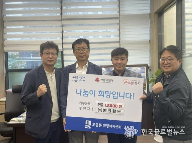 (한국글로벌뉴스 - 박소연 기자) 수원시 팔달구 고등동은 10월 13일, 사회적기업 ㈜에코월드로부터 관내 취약계층을 위한 이웃돕기 성금 100만원을 전달받았다고 밝혔다.