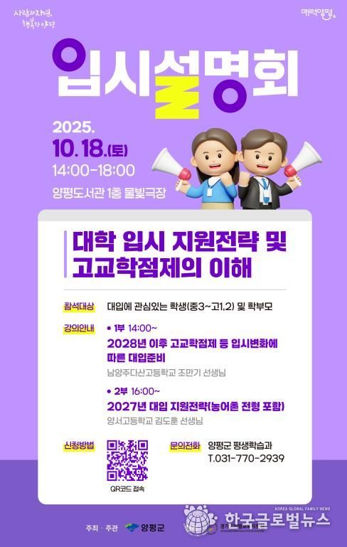 (한국글로벌뉴스 - 박소연 기자) 양평군은 오는 10월 18일 오후 2시, 양평도서관 물빛극장에서 관내 학생과 학부모를 대상으로 ‘2025년 양평군 대학 입시설명회’를 개최한다고 밝혔다. 이번 설명회는 대학 입시에 관심 있는 학생과 학부모에게 다양한 입시 정보를 제공하기 위해 마련됐다.