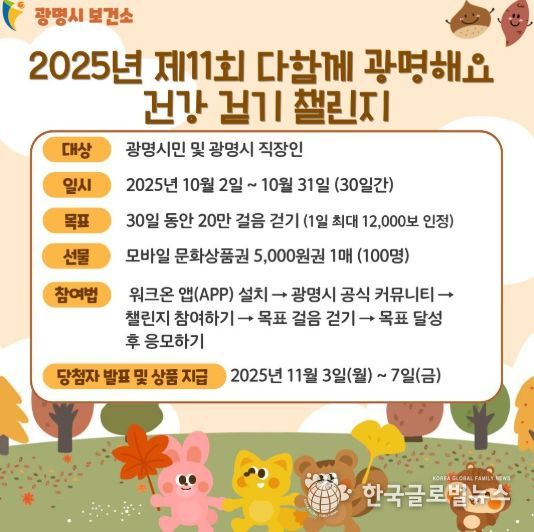 한편 광명시는 오는 31일까지 ‘제11회 다함께 광명해요 건강 걷기 챌린지’를 운영하며, 자세한 사항은 광명시보건소 건강위생과 건강증진팀으로 문의하면 안내받을 수 있다.