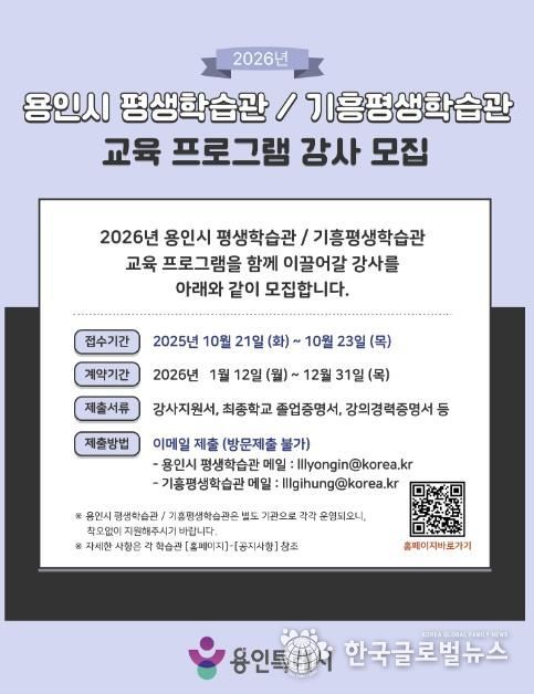 (한국글로벌뉴스 - 박소연 기자) 용인특례시는 21일부터 23일까지 3일간 ‘2026년 평생학습관 프로그램’을 운영할 강사를 모집한다고 15일 밝혔다.