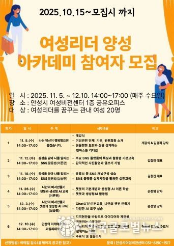 (한국글로벌뉴스 - 박소연 기자) 안성시는 지역사회 발전을 이끌 열정있고 능력있는 여성 지도자를 발굴·육성하기 위해 ‘2025년 안성시 여성리더 양성 아카데미’ 기본과정 교육 참가자를 모집한다.