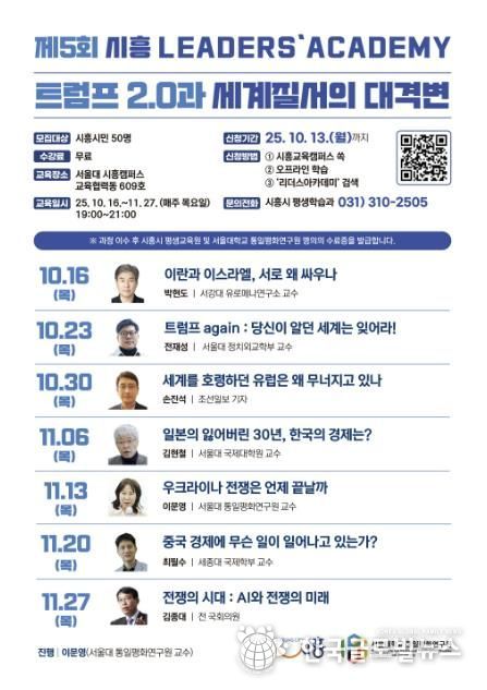 (한국글로벌뉴스 - 박소연 기자) 시흥시는 서울대학교 본부 직속 연구기관인 통일평화연구원과 함께 '제5회 시흥리더스아카데미'를 10월 16일에 개강한다. 이번 아카데미는 '트럼프 2.0과 세계질서의 대격변'을 주제로 급변하는 국제 정세와 세계 질서의 흐름에 대한 시민들의 폭넓은 이해를 돕고자 마련됐다.