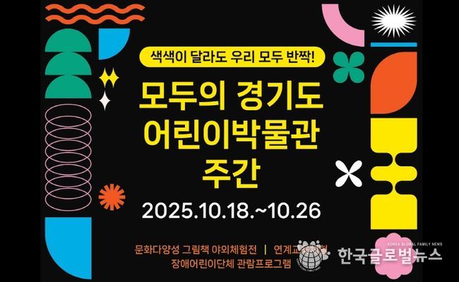 (한국글로벌뉴스 - 박소연 기자) 경기문화재단 경기도어린이박물관(관장 박균수)은 오는 10월 18일부터 10월 26일까지 문화다양성 행사 〈색색이 달라도 우리 모두 반짝! 모두의 경기도어린이박물관 주간〉을 운영한다. 본 행사는 《문화다양성 그림책 야외체험전》, 유아 및 초등 어린이를 위한 연계프로그램, 장애어린이단체 맞춤형으로 개발된 접근성 콘텐츠를 활용한 관람프로그램 시범운영 등 총 3종으로 구성되어 다양한 모습의 관람객을 만나게 된다.