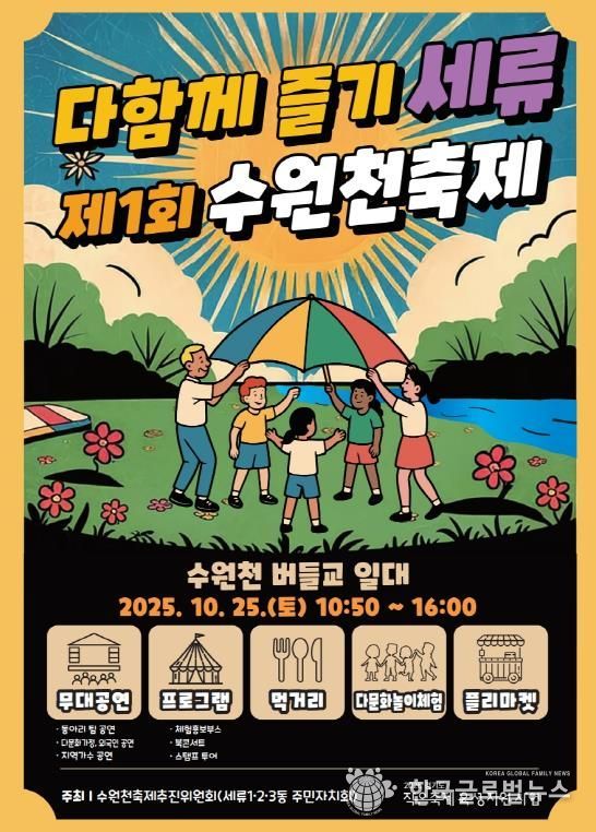 이번 축제는 오전 11시부터 오후 4시까지 진행되며, 다양한 다문화와 지역 주민들이 어우러지는 특별한 장이 될 예정이다. ‘수원천축제추진위원회’는 권선구 세류1·2·3동 주민자치회가 공동으로 협력하여 만든 단체로, 지역사회가 함께하는 축제 개최를 통해 다문화 이해 증진과 주민 화합을 목표로 하고 있다. 이번 행사는 다채로운 공연, 체험 부스, 먹거리 장터 등이 마련돼 방문객들에게 풍성한 즐길 거리를 제공될 예정이다.