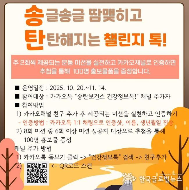 (한국글로벌뉴스 - 박소연 기자) 평택시 송탄보건소는 10월 20일부터 11월 14일까지 카카오톡을 활용한 ‘(송)글송글 땀 맺히고 (탄)탄해지는 챌린지 톡!’을 운영할 예정이라고 밝혔다.