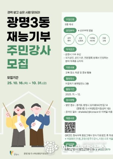박승원 광명시장은 “이번 주민 강사 모집으로 경력이 단절된 여성과 재취업을 희망하는 신중년 등에게 새로운 기회를 제공하고, 지역 공동체 활성화를 이끌겠다”며 “앞으로도 다양한 주민 참여 프로그램으로 지역에 활력을 더하겠다”고 밝혔다.