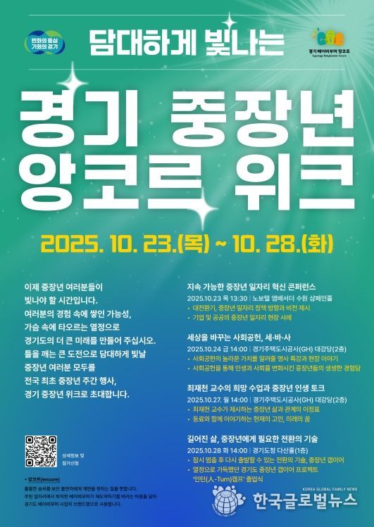 (한국글로벌뉴스 - 박소연 기자) 경기도가 중장년 세대의 도약과 성장을 지원하기 위해 23일부터 28일까지 6일간 ‘경기 중장년 앙코르 위크(week)’을 개최한다.