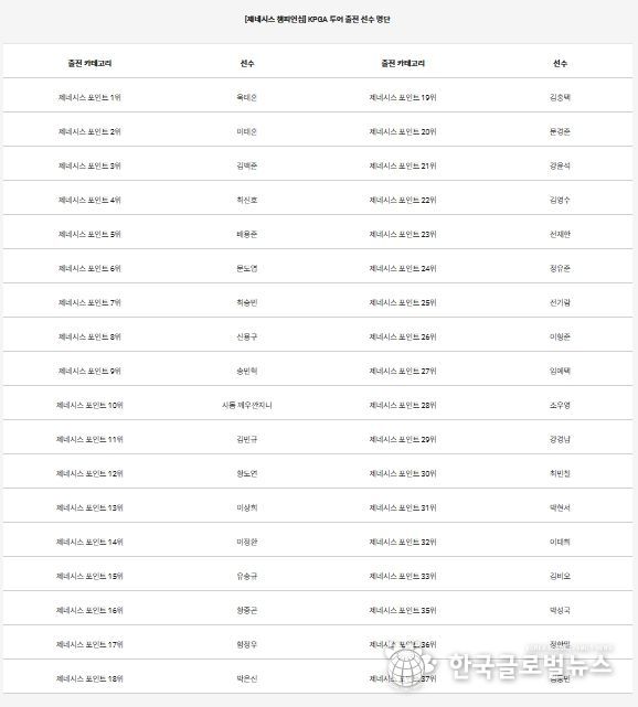 제네시스 포인트 1위 옥태훈(27.금강주택)을 비롯해 2위 이태훈(35.캐나다), 3위 김백준(24.속초아이), 4위 최진호(41.COWELL), 5위 배용준(25.CJ), 6위 문도엽(34.DB손해보험), 7위 최승빈(24.CJ), 8위 신용구(34.금강주택), 9위 송민혁(21.CJ), 10위 사돔 깨우깐자나(27.태국)까지 제네시스 포인트 TOP10 선수들과 36위 정한밀(34.경희), 37위 김동민(27.NH농협은행)까지 제네시스 포인트 상위 36명이 참가자 명단에 이름을 올렸다.