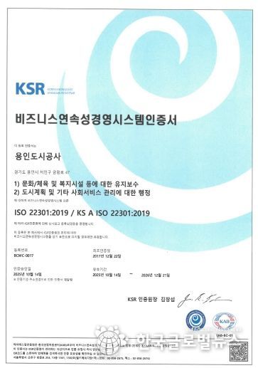 (한국글로벌뉴스 - 박소연 기자) 용인도시공사는 지난 9월 29일부터 30일까지 진행된 ISO45001(안전보건경영시스템) 갱신심사 및 ISO22301(비즈니스연속성경영시스템) 사후관리심사에서 모두 ‘적합’ 판정을 받으며, 국제표준에 부합하는 안전관리체계를 지속적으로 유지하고 있음을 다시 한번 입증했다.
