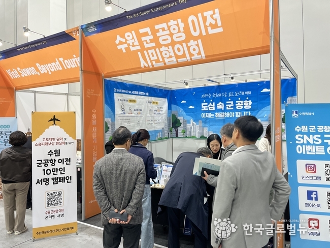(한국글로벌뉴스 - 박소연 기자) 수원군공항이전 및 경기통합국제공항추진 시민협의회(이하 ‘시민협의회’)는 10월 28일(화) 수원컨벤션센터 전시홀(1층)에서 열린 ‘제3회 수원시 기업인의 날’ 행사에 참여하여 ‘수원 군 공항 고도제한 완화 및 소음피해보상 현실화’를 위한 서명 캠페인‘을 전개했다.