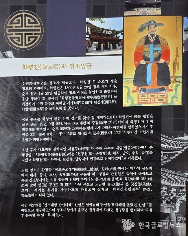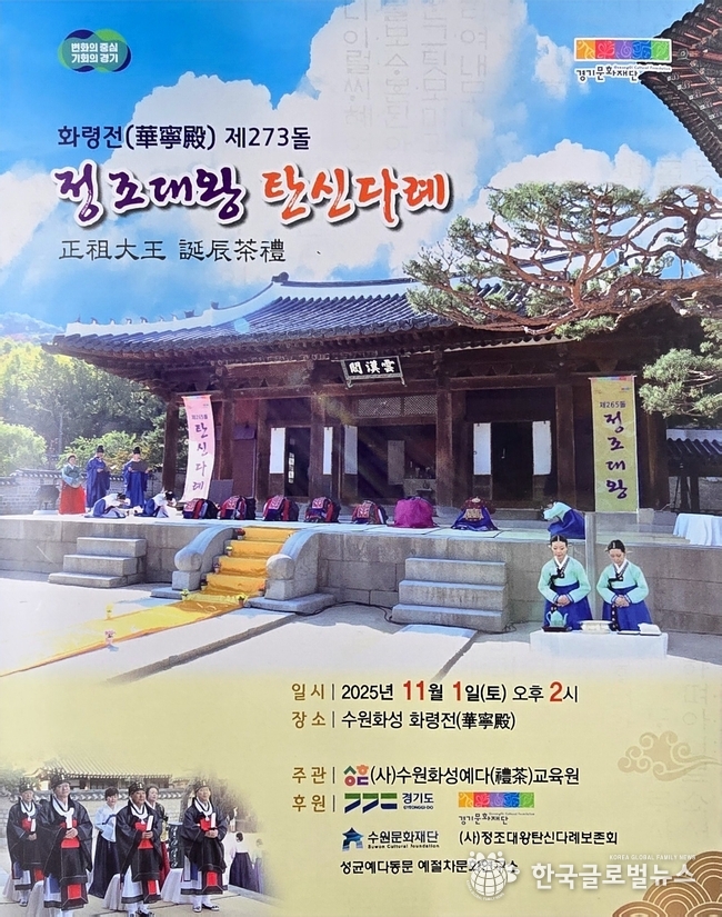 이에 수원시는 정조대왕을 테마로 다양한 행사가 진행되는데 이번에 특별히 진행되는 '화령전 제273돌 정조대왕 탄신다례'는 이번주 토요일(11.1) 오후2시 수원화성 화령전에서 개최 된다.