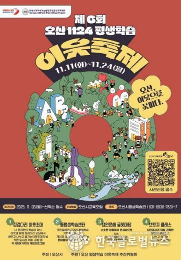 (한국글로벌뉴스 - 박소연 기자) 오산시는 오는 11월 11일부터 11월 24일까지 2주간 ‘2025년 제6회 1124 오산 평생학습 이웃축제’를 개최한다고 밝혔다.