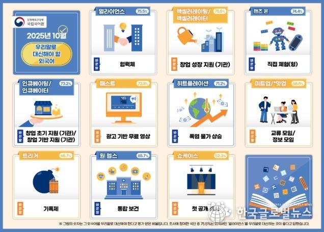 (한국글로벌뉴스 - 박소연 기자) 문화체육관광부와 국립국어원은 우리 사회에 퍼져 있는 외래 용어 12개를 국민이 이해하기 쉬운 우리말로 다듬었다.