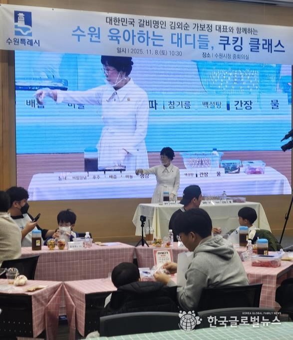 (한국글로벌뉴스 - 박소연 기자) 수원특례시는 8일 시청 중회의실에서 ‘수원 육아하는 대디들(수육대)’ 다섯 번째 오프라인 활동인 ‘쿠킹클래스 with 가보정’을 열었다. 이번 체험에는 수육대 참여 아빠와 자녀 50가족, 120여 명이 함께했다.