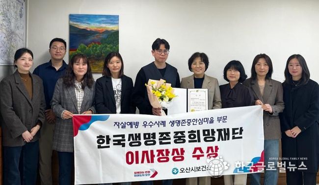 (한국글로벌뉴스 - 박소연 기자) 오산시는 정신건강복지센터가 추진한 ‘생명존중안심마을’ 사업이 자살예방사업 우수사례로 선정되어, 한국생명존중희망재단 이사장상을 수상했다고 21일 밝혔다.