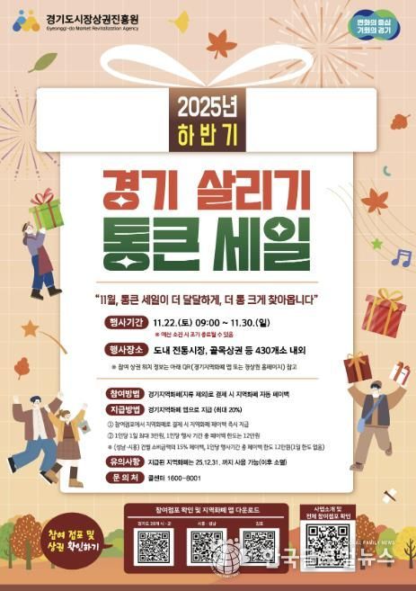 통큰 세일 행사는 예산이 소진될 경우 조기 종료될 수 있다. 지급된 지역화폐는 올해 12월 31일까지 사용할 수 있으며, 이후에는 자동 소멸된다. 사업 관련 문의는 콜센터로 하면 된다. 행사 내용과 참여 상권 정보는 ‘경기지역화폐’ 앱 또는 경기도시장상권진흥원 홈페이지에서 확인할 수 있다.
