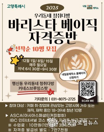 (한국글로벌뉴스 - 박종욱 기자) 고양특례시가 고양시에 거주하거나 활동(재학, 재직)하는 청년들을 대상으로 카페 취·창업에 적용할 수 있는 ‘바리스타 베이직 자격증반’을 운영한다.