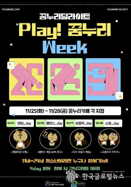 (한국글로벌뉴스 - 박소연 기자) 의왕시청소년재단 산하 의왕시청소년수련관 꿈누리카페(▲고천점( 문화공원로 33), ▲내손점(복지로 109), ▲오전점(찬우물길 11), ▲백운밸리점(백운중앙로 74, 총 4개 지점))는 오는 11월 25일부터 28일까지 4일간 꿈누리딜라이트 『Play! 꿈누리 Week』를 진행한다고 밝혔다.