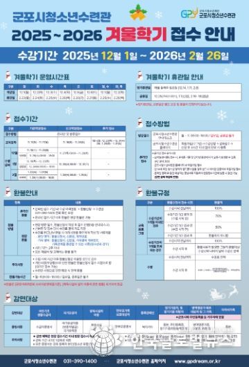 (한국글로벌뉴스 - 박소연 기자) 재)군포시청소년재단 군포시청소년수련관은 오는 12월 1일부터 2025년 2월 26일까지 겨울학기 문화체육 프로그램을 운영한다.