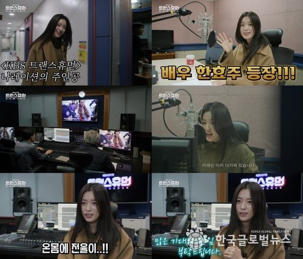 'KBS 다큐' 유튜브 채널에 올라온 메이킹 필름 영상에서는 밝은 표정으로 녹음실에 들어선 한효주가 꾸미지 않은 내추럴한 미모로 먼저 감탄을 자아냈다.