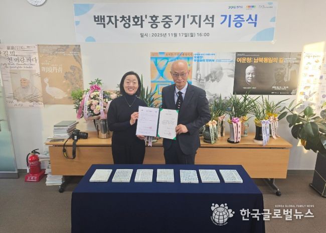(한국글로벌뉴스 - 박소연 기자) 경기문화재단 경기도박물관은 2025년 11월 17일 조선시대 ‘홍중기백자지석’의 기증식을 개최했다. 기증식에는 유물을 기증한 재일교포 이수혜님과 홍중기의 본관인 풍상홍씨 대종회 홍광식 회장, 풍상홍씨 추만공파 종중 홍경희 회장 등이 참석하여 자리를 빛냈다.
