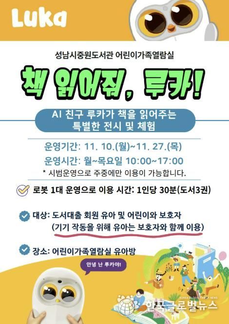 (한국글로벌뉴스 - 박소연 기자) 성남도시개발공사 중원도서관은 지역 어린이들에게 인공지능(AI) 기술을 활용한 새로운 독서 체험 기회를 제공하기 위해 ‘책 친구 로봇, 루카(LUKA)’를 오는 12월까지 운영한다고 21일 밝혔다.