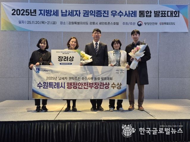 (한국글로벌뉴스 - 박소연 기자) 수원특례시가 행정안전부 주관으로 20~21일 강릉시 세인트존스호텔에서 열린 ‘2025년 납세자 권익 증진 우수사례 통합 발표대회’에서 장려상을 받았다.