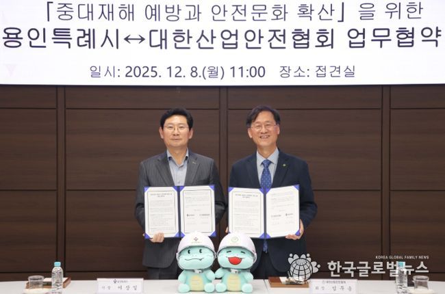 (한국글로벌뉴스 - 박소연 기자) 용인특례시는 8일 시청 4층 접견실에서 대한산업안전협회와 ‘중대재해 예방과 안전문화 확산을 위한 업무협약’을 맺었다.