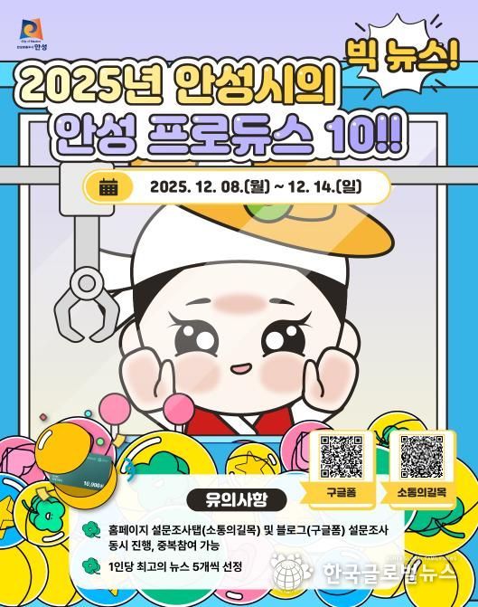 (한국글로벌뉴스 - 박소연 기자) 안성시는 8일부터 14일까지 7일간 ‘2025년을 빛낸 안성시 10대 뉴스’ 선정을 위한 온·오프라인 시민 투표를 진행한다고 밝혔다.