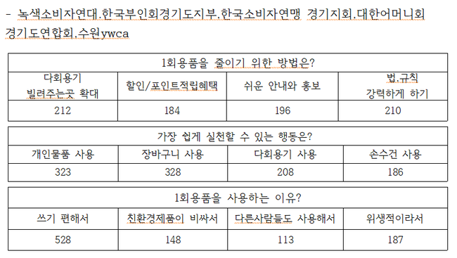 또한 1회용품을 사용하는 주요 이유로는 ‘사용이 편리해서’라는 응답이 가장 많아, 향후 정책과 캠페인에서는 편의성을 대체할 수 있는 실천 환경 조성이 중요 과제로 제시됐다.