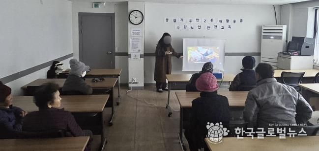 이번 교육은 재활용품 수집 과정에서 발생할 수 있는 교통사고 및 안전사고를 예방하고, 한파에 취약한 어르신들의 건강관리를 돕기 위해 마련됐으며, 안전 관련 동영상 시청을 통해 차도 통행에서 발생할 수 있는 사고 위험성을 안내하고, 재활용품 수집 시 유의 사항과 동절기 한파 대비 건강관리 요령을 중심으로 설명이 이루어졌다.