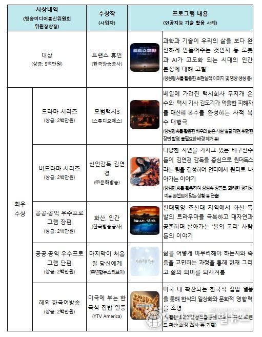 인공지능과 로봇 기술이 인간 정체성에 미치는 영향을 탐구한 한국방송공사(KBS)의 ‘트랜스 휴먼’이 대상을, ▲모범택시3(드라마) ▲신인감독 김연경(비드라마) ▲화산, 인간(공공‧공익 장편) ▲마지막이 처음일 당신에게(공공‧공익 단편) ▲미국에 부는 한국식 집밥 열풍(해외 한국어방송)이 최우수상을 수상했다.