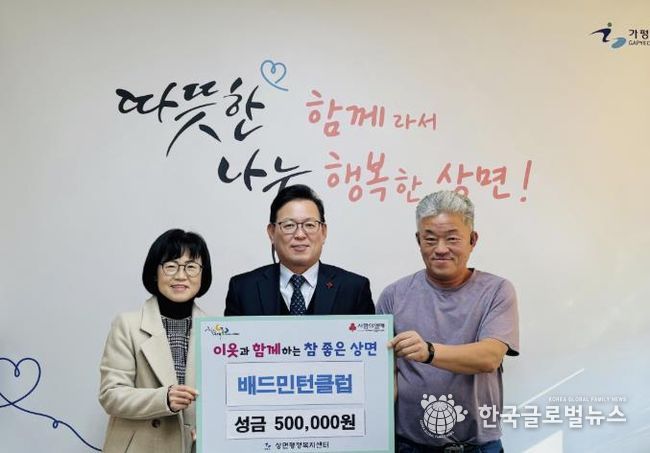 (한국글로벌뉴스 - 박소연 기자) 가평군 상면 배드민턴클럽 회원 일동은 지역 내 어려운 이웃을 돕기 위해 상면 행정복지센터에 성금 50만 원을 기탁했다.