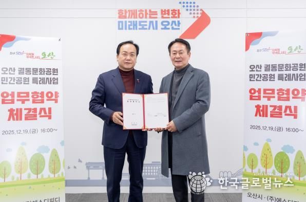 (한국글로벌뉴스 - 박소연 기자) 오산시는 12월 19일 오산시청에서 궐동문화공원 민간공원조성 특례사업의 원활한 추진을 위해 사업 시행자인 ㈜에스디피디와 협약을 체결했다.