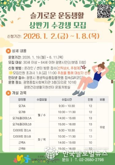 (한국글로벌뉴스 - 박소연 기자) 광명시 광명건강생활지원센터는 새해를 맞아 시민들의 건강한 생활습관 형성과 만성질환 예방을 위해 2026년 상반기 ‘슬기로운 운동생활’ 운동 프로그램 참여자를 모집한다.