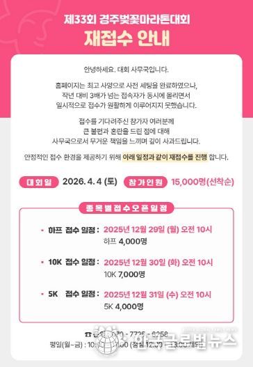 경주시 관계자는 “전국 러너들의 높은 관심으로 접속이 일시적으로 집중됐다”며 “접수 지연으로 불편을 드린 점에 대해 양해를 구하고, 안정적인 접수와 안전한 대회 운영을 위해 만전을 기하겠다”고 말했다.