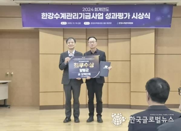 (한국글로벌뉴스 - 박소연 기자) 양평군은 지난 19일 한강유역환경청이 실시한 ‘2024년도 한강수계관리기금 성과평가’에서 주민지원사업 부문 최우수, 오염총량관리사업 부문 장려를 수상했다고 밝혔다.