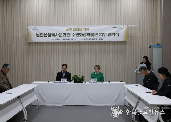 (한국글로벌뉴스 - 박소연 기자) 남한산성역사문화관과 수원화성박물관은 2025년 12월 23일, 남한산성역사문화관에서 세계유산 성곽의 연구·보존·활용을 위한 업무협약(MOU)을 체결했다.