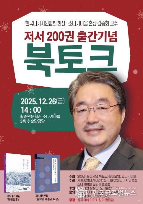 (한국글로벌뉴스 - 박소연 기자) 황순원문학촌 소나기마을은 오는 26일 오후 2시, 김종회 촌장의 저서 200권 출간을 기념해 북토크를 개최한다고 밝혔다. 이번 행사는 양평군 서종면 소나기마을 수숫단강당 3층에서 열리며, 서울중랑디카시인협회와 서울양천디카시인협회, 소나기마을 문화예술포럼이 주관하고 200권출간기념북토크준비모임과 소나기마을이 주최한다.