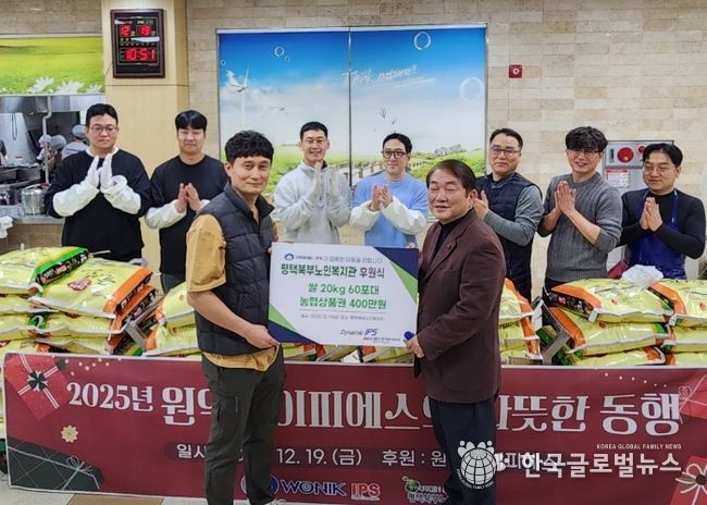 (한국글로벌뉴스 - 박소연 기자) 원익IPS는 12월 19일, 평택북부노인복지관에 쌀 20kg 60포와 온누리 상품권 4,000,000원을 기부하며 따뜻한 나눔을 실천했다. 이번 전달식은 지역사회 나눔 문화 확산에 앞장서 온 원익IPS의 꾸준한 사회공헌 활동의 일환으로, 지역 내 어르신들에게 실질적인 도움을 주기 위한 의미있는 기부로 진행됐다.