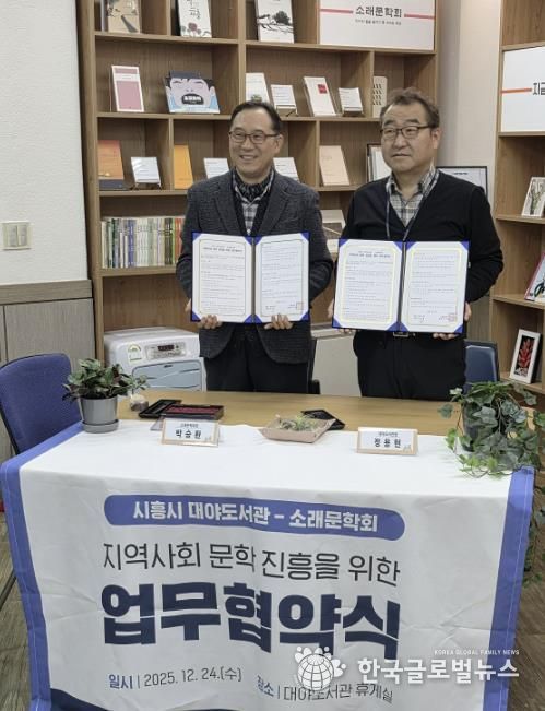 (한국글로벌뉴스 - 박소연 기자) 시흥시 대야도서관은 지역 문학단체인 소래문학회와 지난 12월 24일, 대야도서관 휴게실에서 지역 문학 진흥 및 독서문화 확산을 위한 업무협약을 체결했다.