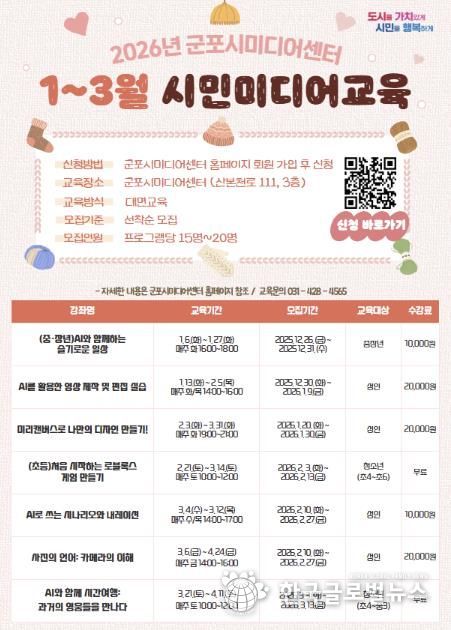 (한국글로벌뉴스 - 박소연 기자) 군포시미디어센터는 시민들의 미디어 활용 역량 강화를 위해 2026년 1분기 미디어교육 프로그램 수강생을 모집한다.