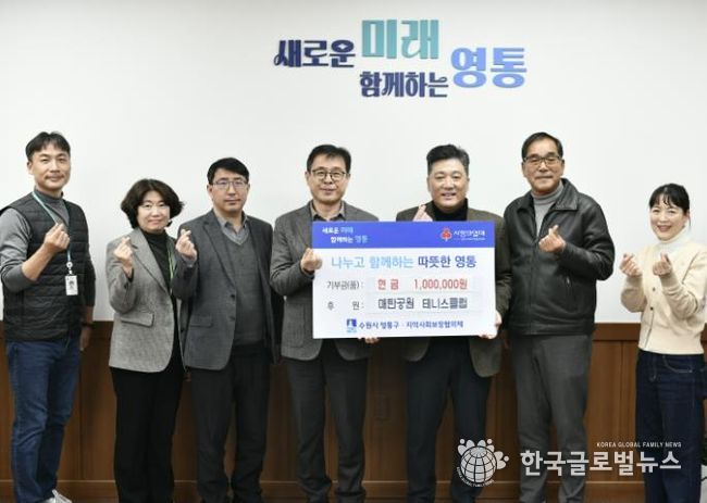 (한국글로벌뉴스 - 박소연 기자) 수원시 영통구는 지난 24일 관내 ‘매탄공원 테니스클럽’ 단체에서 영통구 취약계층을 위해 100만 원의 후원금을 기부했다고 밝혔다.