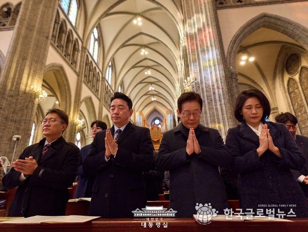 (한국글로벌뉴스 - 박소연 기자) 이재명 대통령과 김혜경 여사가 25일 서울 중구 명동대성당에서 열린 성탄 대축일 미사에서 기도를 하고 있다.
