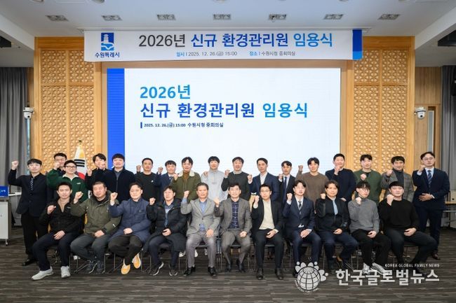 (한국글로벌뉴스 - 박소연 기자) 수원특례시가 26일 시청 중회의실에서 2026년 신규 환경관리원 임용식을 열고, 신규 임용자 21명에게 임용장을 수여했다.