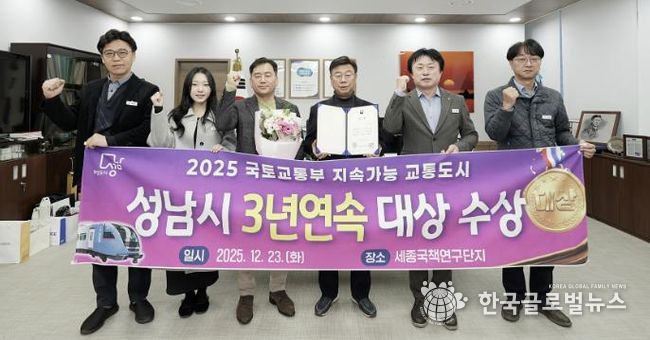 (한국글로벌뉴스 - 박소연 기자) 성남시가 국토교통부 주관 ‘2025 지속가능 교통도시 평가’에서 대상을 수상하며 3년 연속 최고 평가를 받았다. 2023년과 2024년에 이어 올해까지 연속 수상을 이어가며, 친환경 교통 정책과 대중교통 중심 도시 전략의 성과를 다시 한번 입증했다.