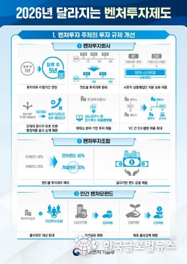 (한국글로벌뉴스 - 박종욱 기자) 중소벤처기업부는 「벤처투자 촉진에 관한 법률」 및 하위법령(시행령, 시행규칙) 개정을 바탕으로 ’26년에 새롭게 달라지는 벤처투자 제도를 발표했다고 밝혔다.