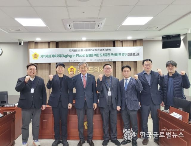 (한국글로벌뉴스 - 박소연 기자) 경기도의회 도시환경연구회(회장 김시용, 도시환경위원장)는 7일 오후 경기도의회 도시환경위원회 회의실에서 ‘지역사회 계속거주(Aging In Place) 실현을 위한 도시공간 조성방안 연구’에 관한 정책연구용역 최종보고회를 개최했다.
